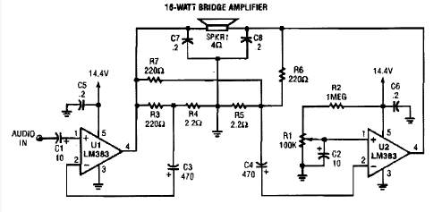 Usando o LM383 este circuito foi encontrado numa Popular Electronics dos anos 90. A fonte deve ser de 14V e os circuitos integrados dotados de bons dissipadores de calor.