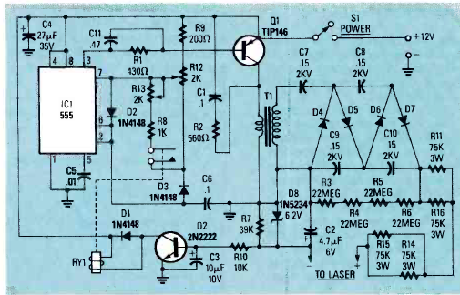 Esta fonte para laser HeNe foi encontrada na revista Radio Electronics de março de 1989. Esta fonte gerava alguns milhares de volts para a ignição do gás.