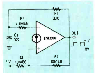 Este oscilador de 1 kHz utiliza um operacional de Norton LM3900. A frequência depende de C1 e R1 podendo ser alterada.
