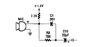 Este circuito possibilita o uso de um microfone de eletreto com fonte de 1,5 V. Encontramos na Enciclopédia de Circuitos Eletrônicos volume 5 de 1995.