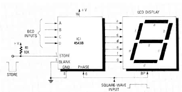 Este circuito CMOS para displays de LEDs é de uma revista Radio Electronics de fevereiro de 1989. O circuito tem um pulso de habilitação de armazenamento do valor apresentado no display.