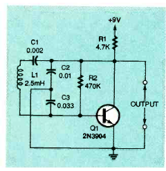 Este oscilador transistorizado que é uma modificação do oscilador de Colpitts foi encontrado na revista Electronics Now de janeiro de 19996. A frequência depende de L1.