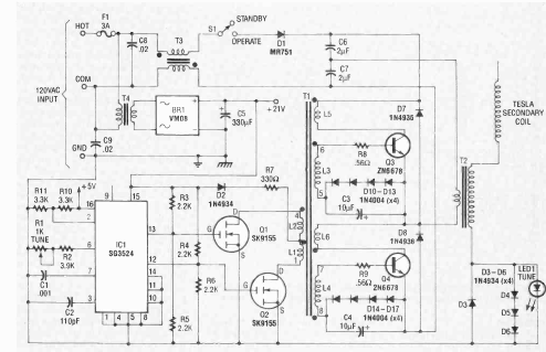 Este circuito é um dos muitos que temos em nossa seção. Foi tirado da revista Electronics Experimenter Handbook de 1993. L1 tem 10 espiras e L2 tem 1 000 espiras num tubo de PVC ou papelão de 1 a 2 polegadas.