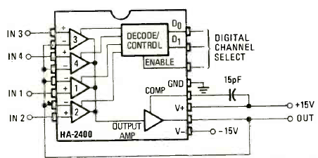 Este circuito apresentando um novo amplificador operacional quadruplo foi encontrado na revista Radio Electronics de março de 1980. O circuito deve ser alimentado por fonte simétrica de 15 V.