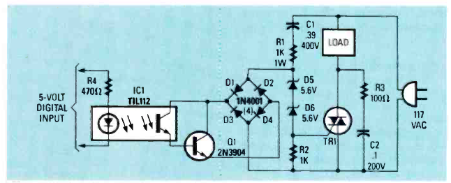 Este circuito é um excelente shield para microcontroladores tendo sido encontrado na revista Radio Electronics de outubro de 1987. Ele pode ser usado com outras tensões, conforme o triac e o opto-isolador admite versões mais modernas.