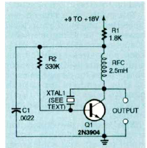 Esta versão do oscilador de Pierce com o 2N3904 foi encontrada na revista Electronics Now de janeiro de 1994. O cristal pode ter de 1000 kHz a alguns megahertz.