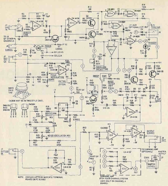 Este sofisticado sintetizador de som de tambor saiu na revista Radio Electronics de maio de 1980. O circuito se baseia em circuitos integrados comuns devendo sua saída ser ligada a um amplificador.