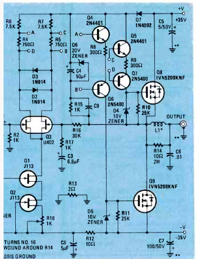 Este amplificador que deve ter uma potência de perto de 100 W foi encontrado na revista Radio Electronics dee julho de 1983. A corrente de repouso deve ser ajustada em 100 mA.