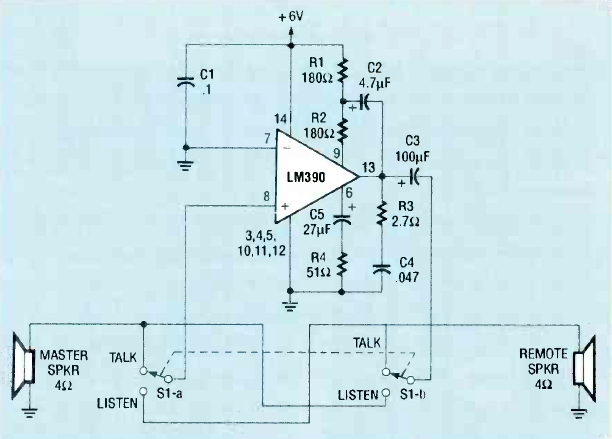 Este intercomunicador com fios para dois canais foi encontrado na revista Radio Electronics de abril de 1990. A distância máxima dos cabos depende da espessura dos cabos.