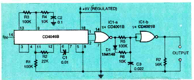 Encontramos este circuito na revista Electronics Now de outubro de 1994. O circuito usa um PLL 4046 pouco comum atualmente e as portas de um CMOS 4001.