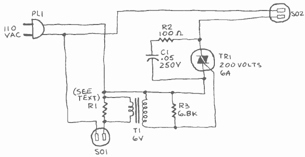 A ideia deste circuito é de que quando o aparelho em SO1 for ligado, automaticamente o aparelho ligado em SO2 recebe alimentação. O circuito é de uma Radio Electronics de janeiro de 1985.
