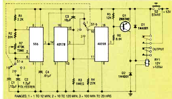 Este circuito foi encontrado num artigo sobre o 555 da revista Radio Electronics de novembro de 1992. O circuito usa relé de 12 V e tem duas faixas de temporizações.