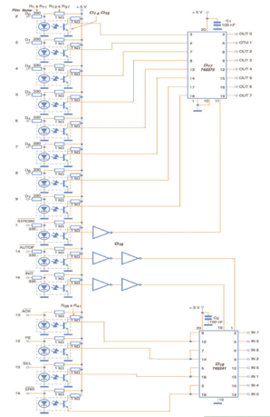 O circuito ilustrado na figura permite acionar cargas externas (8) a partir de sinais da porta paralela e também fazer a aquisição de dados pela mesma porta, bastando para isso comutar as devidas habilitações das funções I/O. O acoplamento (tanto dos sinais de entrada como de saída), é feito através de acopladores ópticos, o que significa um elevado grau de segurança para a integridade dos circuitos do PC. A fonte para os circuitos TTL deve ser externa com um terra comum, e as portas inversoras podem ser de qualquer tipo TTL como as 7805.