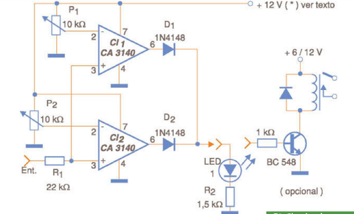 O circuito visto na figura é recomendado para aplicações em que se deseja ter uma indicação visual quando a tensão de entrada está fora de uma faixa determinada de valores. Por exemplo, em uma fonte de alimentação para circuitos TTL, ele pode ser ajustado para indicar quando a tensão está abaixo de 4,5 V ou acima de 5,5 V. São usados dois amplificadores operacionais com transistores de efeito de campo do tipo CA3140, mas equivalentes podem ser experimentados, inclusive tipos bipolares como o 741 ou o duplo operacional MC1458. Apenas deve-se ficar atento para as tensões de operação dos amplificadores escolhidos. Os dois valores de acionamento são ajustados nos trimpots que, para maior precisão, podem ser do tipo multivoltas. Os diodos são de uso geral e o LED indicador de qualquer cor. Pode ser utilizada uma etapa amplificadora para acionar um relé ou ainda um sistema de aviso. O circuito pode ser empregado com fontes de 5 a 12 V