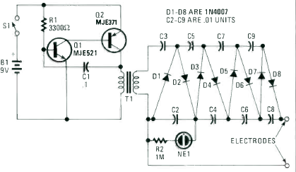 Esta defesa eletrônica foi encontrada na edição especial de 1990 da revista Radio Electronics Experimenter. Ela gera uma tensão de algumas centenas de volts.