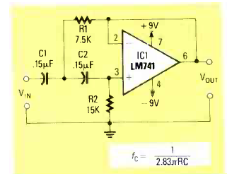 Este filtro foi encontrado na revista Radio Electronics de maio de 1989. A fonte de alimentação deve ser simétrica. Os componentes podem ser alterados para operar em outras frequências. O filtro é do tipo passa-altas.