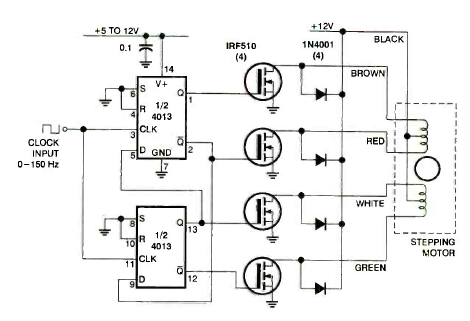 Este controle de motor de passo de 12 V foi encontrado na revista Electronics Now de agosto de 1996. O circuito tem uma entrada de pulsos e os MOSFETs podem ser praticamente de qualquer tipo.
