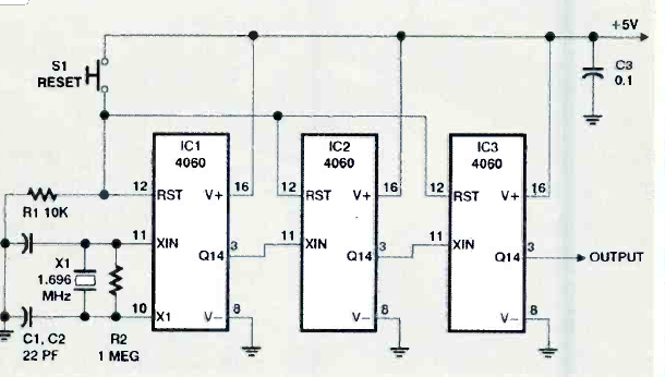 Este circuito extremamente lento produz um pulso por mês podendo ser usado num timer. Encontramos na revista Electronics Now de novembro de 1998.