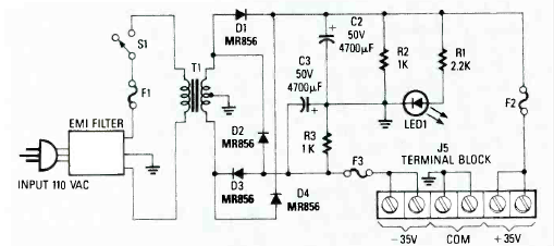Esta fonte foi encontrada na mesma edição especial de 1990 da revista Radio Electronics Experimenter que descreve um amplificador de até 100 W por canal com o LM12.