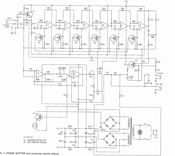 A finalidade deste circuito encontrado na revista Radio Electronics de setembro de 1977 é produzir o efeito de vibrato. Trata-se de um circuito de deslocamento de fase trabalhando com operacionais comuns.