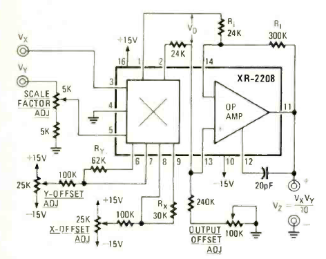 Este circuito de aplicação do XR2208 foi encontrado na revista Radio Electronics de abril de 1978. O circuito deve ser alimentado por uma tensão de 15 V e existe um ajuste de offset.