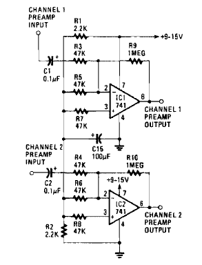 Encontramos este circuito num Radio Experimenter Handbook dos anos 90. O circuito faz uso dos operacionais 741 e tem bom ganho sem fonte de alimentação simétrica.
