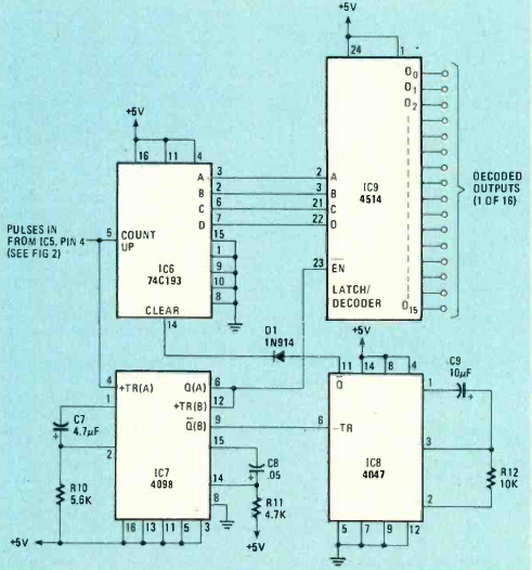 Para funcionar com os circuitos anteriores, este decodificador fornece uma saída1 de 10. O circuito é de uma Radio Electronics de agosto de 1984. Veja os circuitos anteriores.