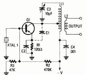 Este circuito gera um sinal correspondente a harmônica do cristal utilizado. A frequência é dada pelo ajuste de C3 e por L1. O circuito é de uma revista Radio Electronics de novembro de 1986. Q1 pode ser o 2N2222.