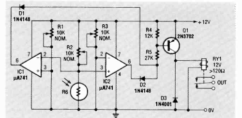 Este circuito detecta uma janela de luz usando dois operacionais. O circuito é de uma Radio Electronics de julho de 1992.