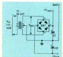 Esta é uma configuração típica de fonte simétrica. A tensão do transformador determina a tensão de saída e também dos capacitores utilizados.
