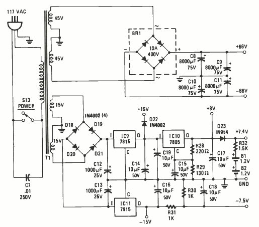 Esta é a fonte de alimentação para o amplificador doi circuito anterior. Os reguladores de tensão devem ser dotados de dissipador de calor e o transformador é de alta corrente.