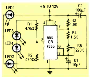 Encontrado na revista Radio Electronics de janeiro de 1992, este circuito tem a frequência controlada por R5. Essa frequência pode ser ajustada entre 15 Hz e 2KHz.