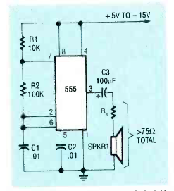 Encontrado num artigo da revista Radio Electronics de outubro de 1992 este circuito gera um tom de pequena potência num alto-falante. R deve ser calculado para que a impedância de saída seja maior que 75 ohms.