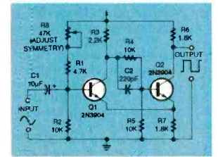 Este disparador de Schmitt que converte sinais retangulares em quadrados foi encontrado na revista Electronics Now de janeiro de 1994. O circuito emprega transistores comuns de uso geral.