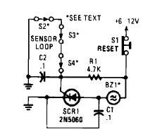 Este circuito sem sensores em série disparando um SCR foi encontrado no volume 5 da Enciclopédia de Circuitos Eletrônicos de 1995. O circuito pode ter o número de sensores alterado.