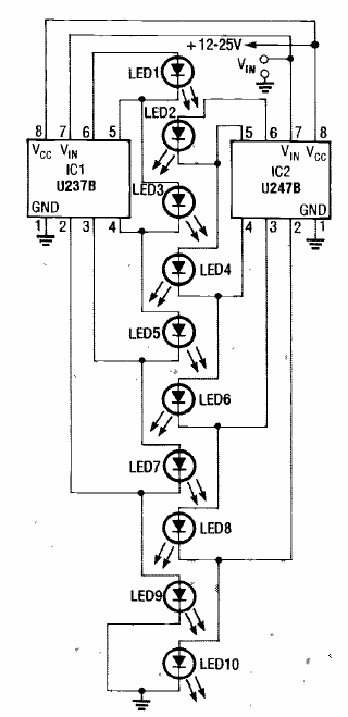 Este circuito linear de Bargraph foi encontrado na revista Radio Electronics de fevereiro de 1992. A escala de 10 LEDs mede de 0 a 1 V.