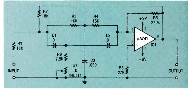 Este filtro que rejeita uma faixa de frequências determinada pelo duplo T foi encontrado na revista Electronics Now de agosto de 1993. A fonte deve ser simétrica.