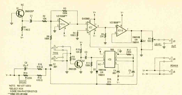 Este circuito que simula o som de tambor faz parte de um artigo publicado na revista Radio Electronics de dezembro de 1979. O circuito tem ajuste de decaimento e a alimentação deve ser feita por fonte simétrica.