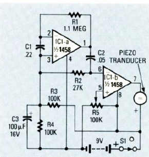 Usando um capacitor com sensor este circuito ode detectar sinais de 50 MHz a 500 Hz, segundo a revista Radio Electronics de julho de 1986. O capacitor C1 funciona como sensor, sendo do tipo cerâmico.