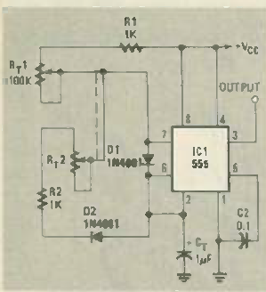 Com este circuito é possível variar a frequência de um 555 mas mantendo o ciclo ativo constante. O circuito é de uma revista Radio Electronics de julho de 1985.