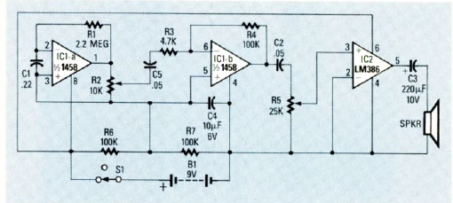 Este circuito foi encontrado na revista Radio Electronics de julho de 1986. O circuito tem um sistema de aviso por alto-falante. O sensor é o capacitor cerâmico C1 que funciona como linha de transmissão.