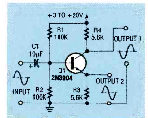 Este circuito fornece dois sinais de áudio a partir de uma entrada. Os sinais aparecem nas saídas com fases invertidas. Este circuito também e conhecido como Phase Splitter. Encontramos na revista Electronics Now de novembro de 1993.