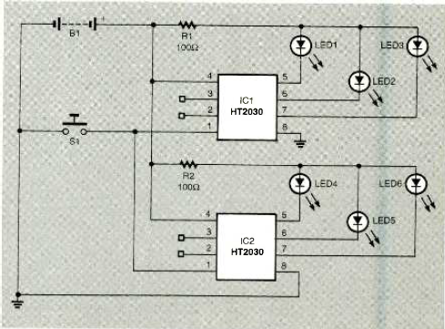 Este circuito com dois HT2030 alimenta 6 LEDs num sistema piscante decorativo. O circuito é da revista Electronics Now de dezembro de 1997. Os LEDs são alimentos em sequência.