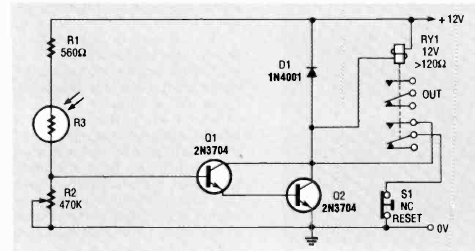 Este circuito sensível simples foi sugerido por uma Radio Electronics de julho de 1992. O relé é de duplo contacto reversível. O ajuste de sensibilidade é feito em R2.