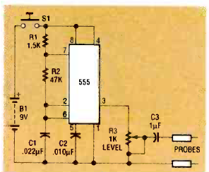 Esta aplicação do 555 foi encontrada na revista Radio Electronics de novembro de 1992. A frequência do sinal gerado que é retangular é determinada por C1.