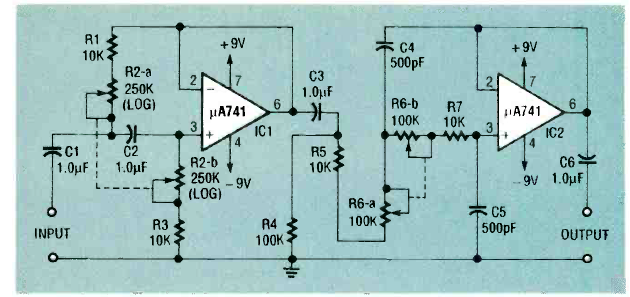 Este filtro de áudio foi encontrado na revista Radio Electronics de agosto de 1993. Ele corta baixas e altas frequências correspondentes ao rumble e Scratch que são ruídos que aparecem em toca-discos.