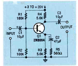 Utilizando um transistor de uso geral esta etapa tem ganho de tensão igual a 10. O circuito foi obtido na revista Electronics Now de novembro de 1993.