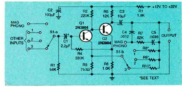 Encontramos este circuito de preamplificador universal em uma Electronics Now de março de 1994. Ele possui diversos tipos de equalização conforme a entrada de sinal.