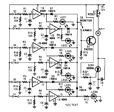 Encontramos este circuito na Einciclopédia de Circuitos Eletrônicos de 1995..O circuito dispara um buzzer a partir de diversos sensores. A edição é da Poptronics.