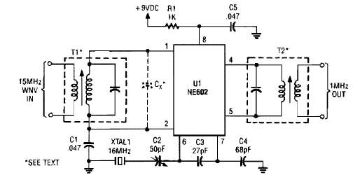 Este conversor para sinais da estação WWV de referência horária foi encontrado numa Popular Electronics. Os sinais de 15 MHz passam a ser recebidas num rádio de ondas médias em 1 MHz.
